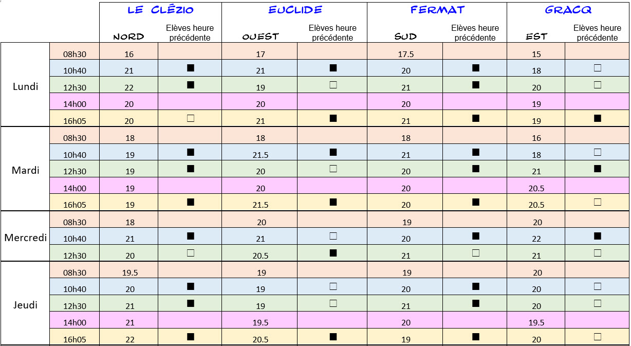 Remarque : une partie seulement du tableau figure ci-dessus. Le tableau fourni a été rempli "à la main" et les cases cochées en noir ici étaient des cases à cocher pour indiquer s'il y avait eu cours à l'heure précédente.