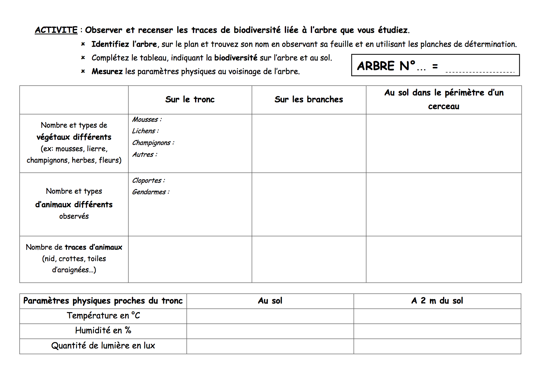 Les paramètres physiques sont mesurés à proximité de chaque arbre (température, lumière et taux d'humidité)