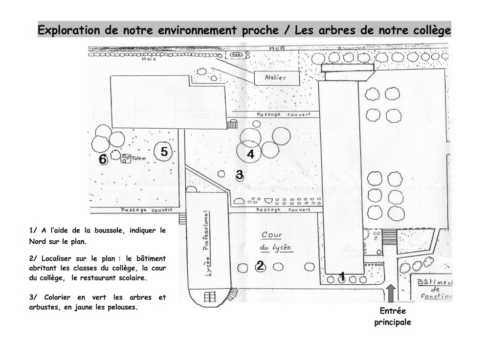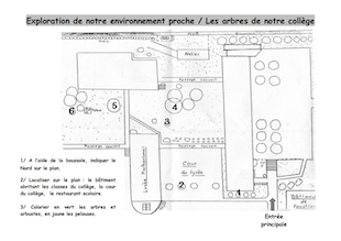 Les élèves munis d'un plan du collège vont devoir se repérer et relever des traces de biodiversité au niveau de différents arbres numérotés sur ce plan.