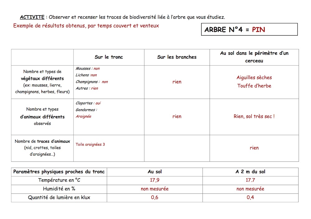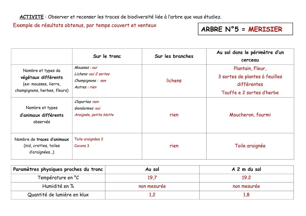 Des différences ont été observées entre 2 arbres de même essence; un planté dans la cour et entouré de goudron et l'autre sur un carré de pelouse que l'on n'avait volontairement pas tondu tout l'été. On a pu montrer une biodiversité végétale plus importante autour de l'arbre avec la pelouse avec en particulier la présence de criquets et d'une branche sur le sol permettant la présence de cloportes et fourmis.