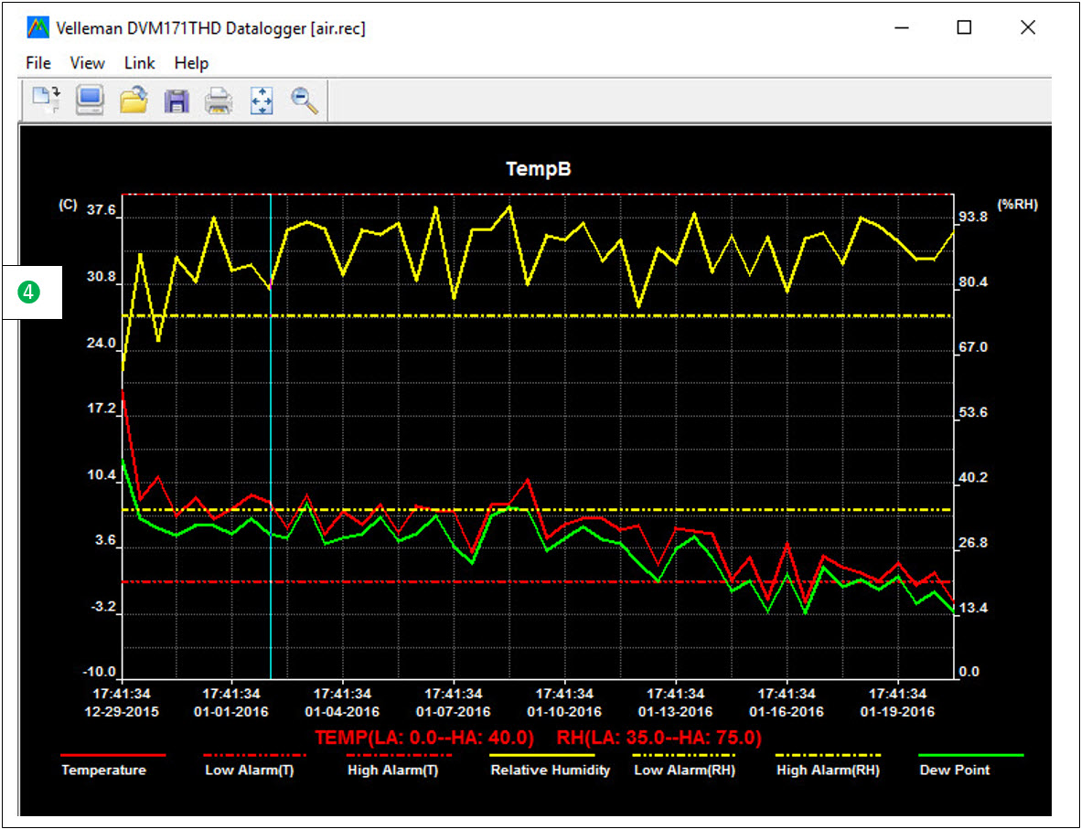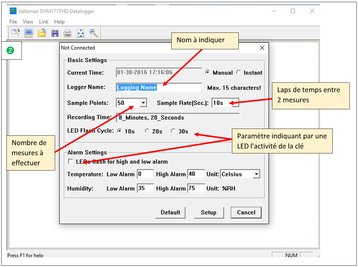 - Dans cet exemple, pour économiser les piles, les LED ont été placées sur 30s et l'alarme décochée. Le laps de temps entre 2 mesures est fixé à 12 h, et le tout sur 50 points, soit 25 jours.