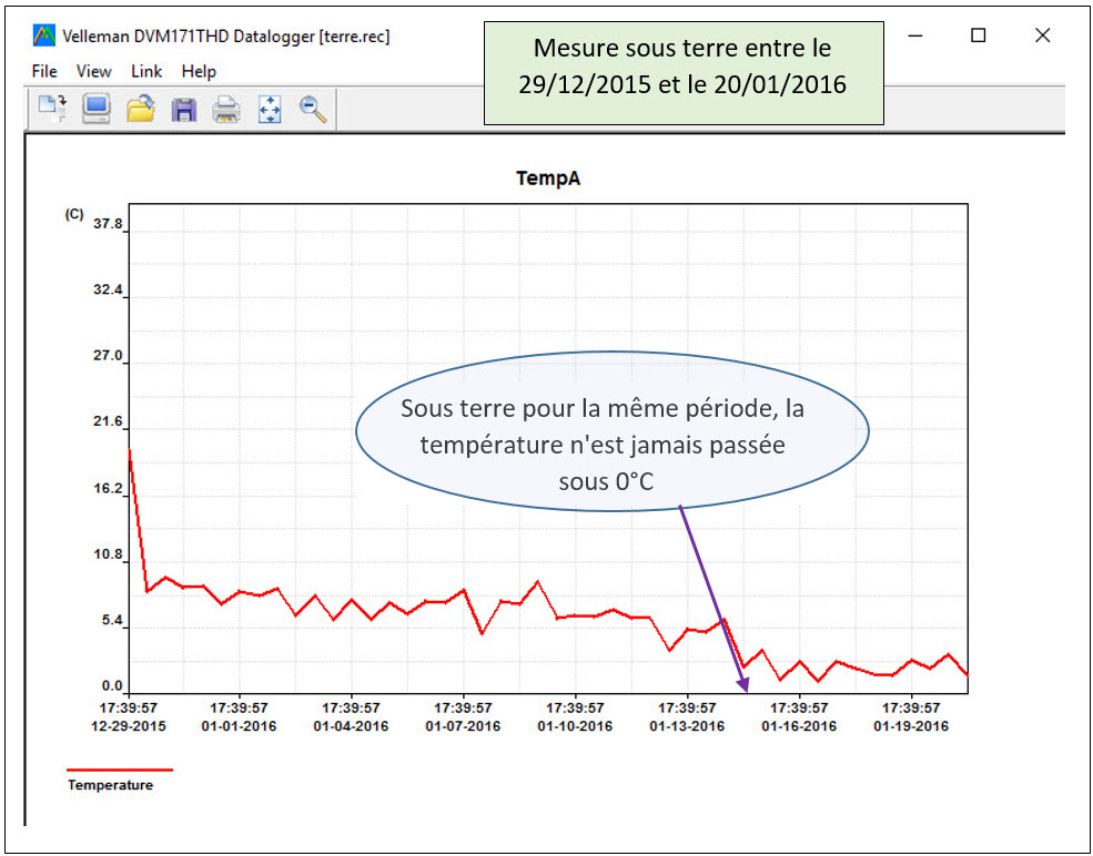 3 - Placer les capteurs l'un sous abri ou non et l'autre sous terre pour montrer que dans le sol, les végétaux (organes de réserves) et les animaux (larves d'insectes hibernantes) ne gèleront pas et reprendront leur activité au printemps. Si en surface l'activité animale et végétale semble "ralentie" en hiver, sous terre des relations trophiques grâce au caractère isolant de la terre perdurent, notamment celles des décomposeurs.