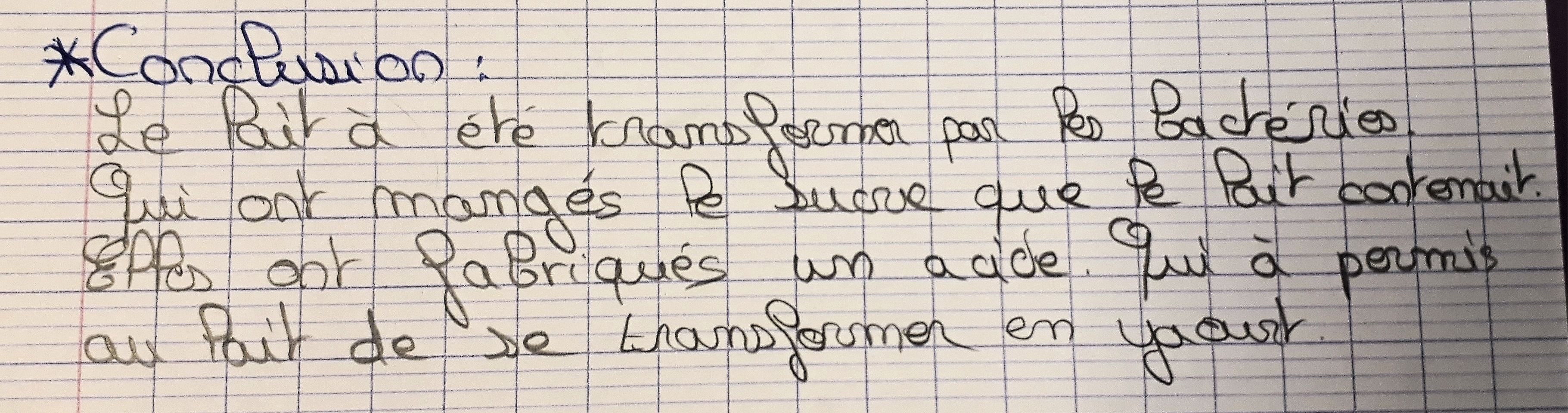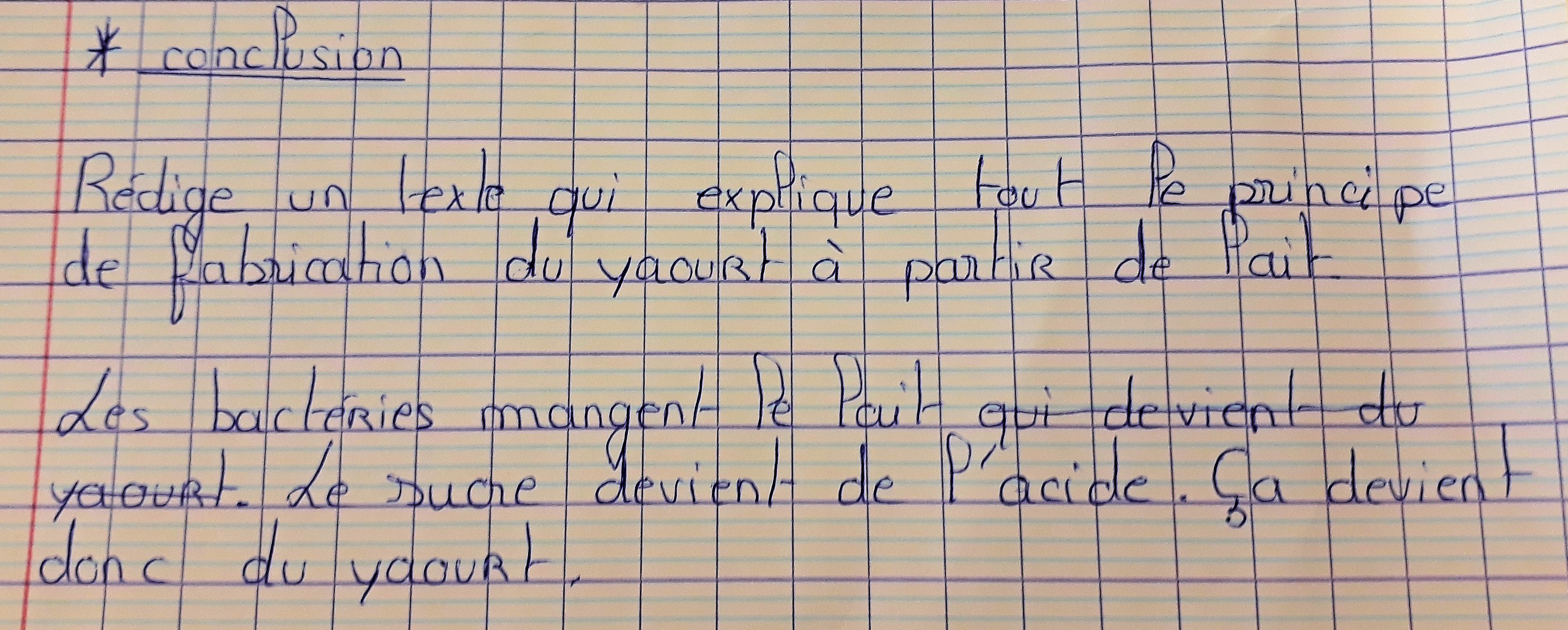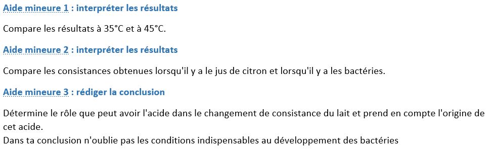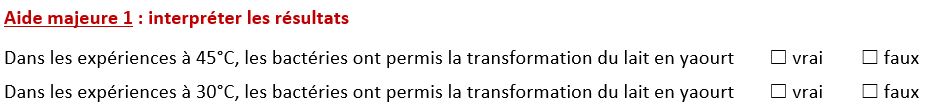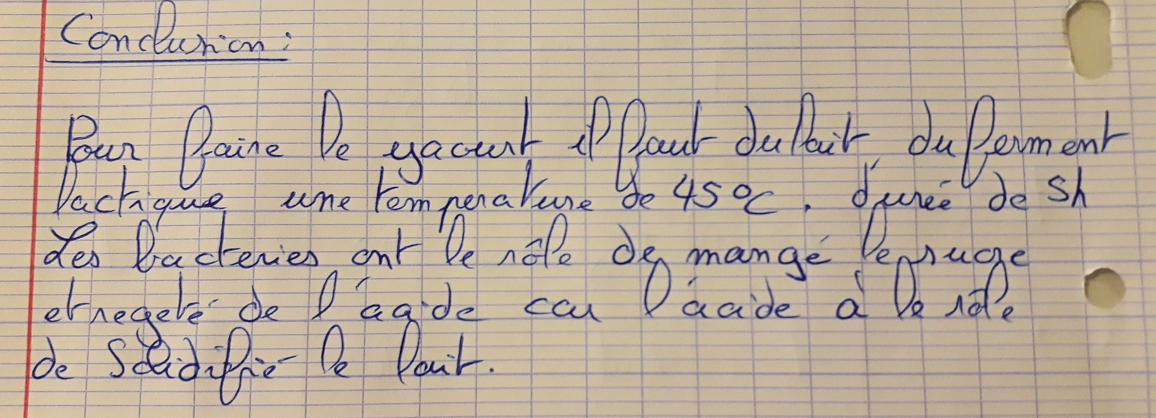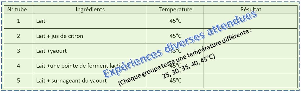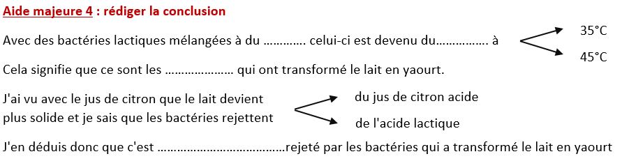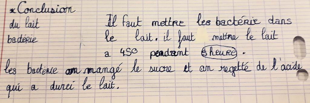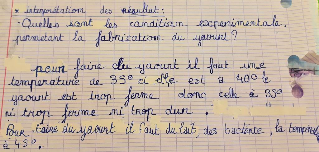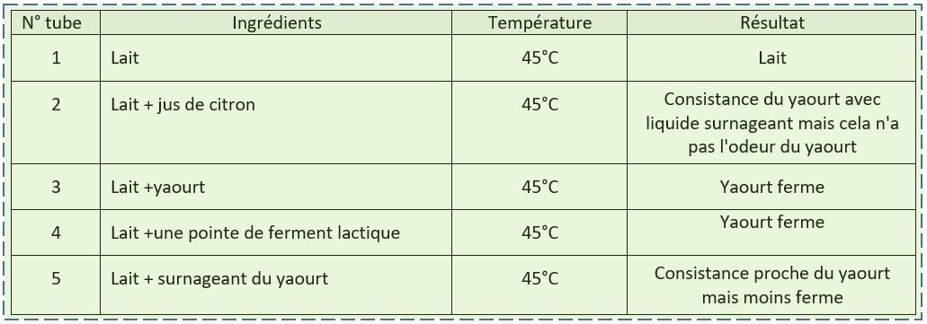 - Les élèves doivent individuellement au vu des résultats des différents groupes écrire un texte qui expliquera ce qui s'est passé dans les tubes où du yaourt est apparu.