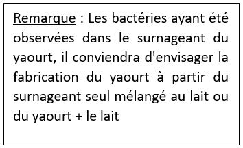- Les élèves voient que le yaourt contient des micro-organismes qui sont des bactéries et en déduisent que peut-être faut-il en ajouter au lait pour fabriquer le yaourt.