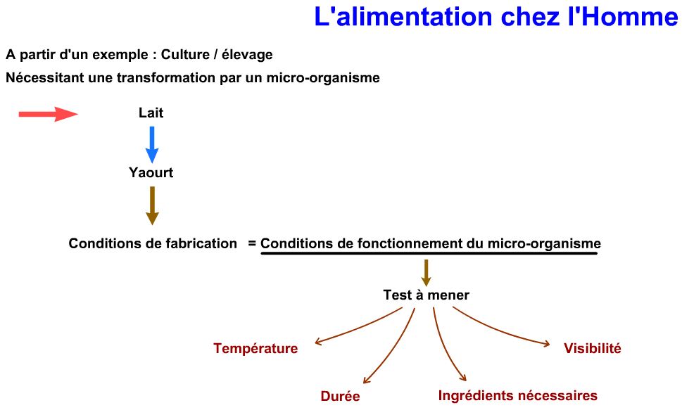 L'enseignant explique à la classe le choix du yaourt et ajoute que sa fabrication nécessite un micro-organisme dont les conditions de fonctionnement seront à déterminer (voir schéma)