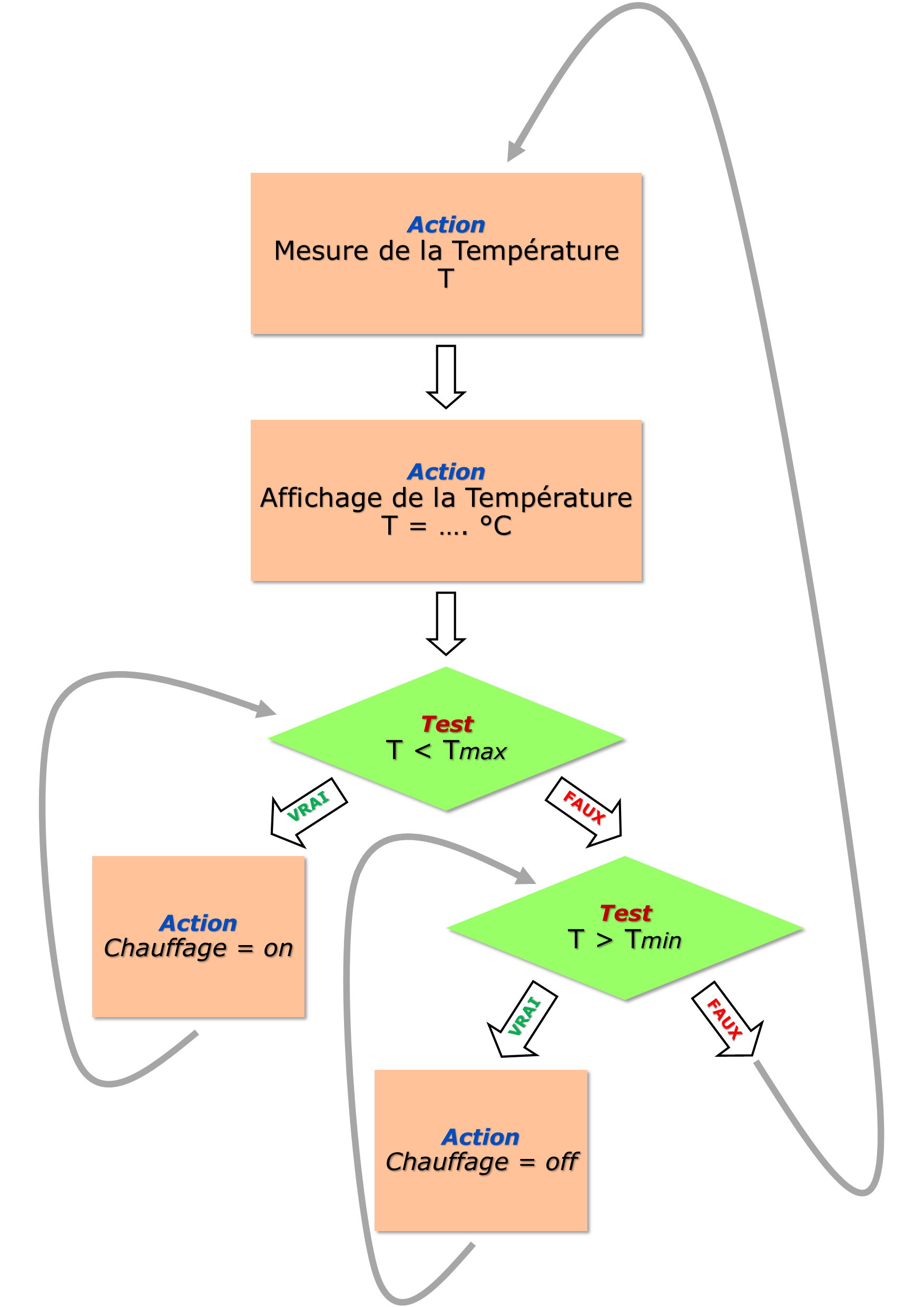 - Une partie programmation concernant les capteurs de température est réalisée en Physique-chimie. Cette partie se décompose en 3 phases : - Phase 1 : Les élèves doivent proposer un schéma logique permettant de maintenir la température constante en pilotant la résistance chauffante. Ce travail sera l’occasion de revenir sur les notions de grandeurs mesurables, d’unités et d’appareils de mesure. Les énergies et leurs conversions pourront être abordées en étudiant le fonctionnement de la résistance chauffante et du ventilateur de la yaourtière.