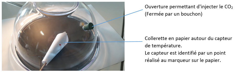 - L'injection du CO2 en bonbonne refroidit systématiquement la température dans le saladier. Il peut être envisagé de détendre le gaz au préalable dans un ballon de baudruche pour lui permettre de passer à température ambiante avant d'être injecté dans le dispositif.