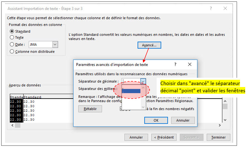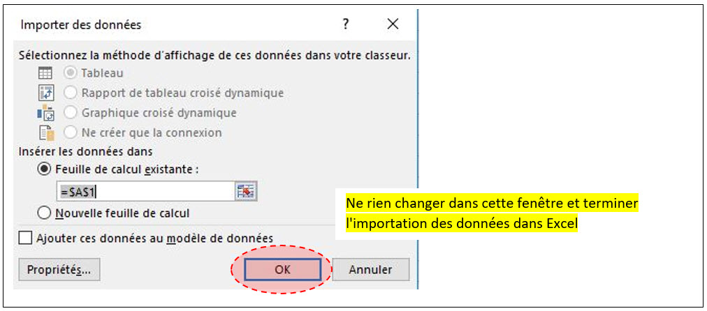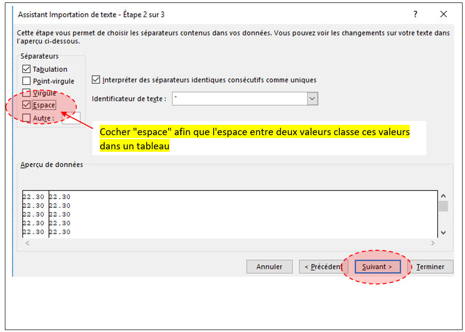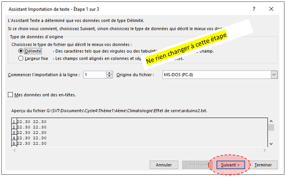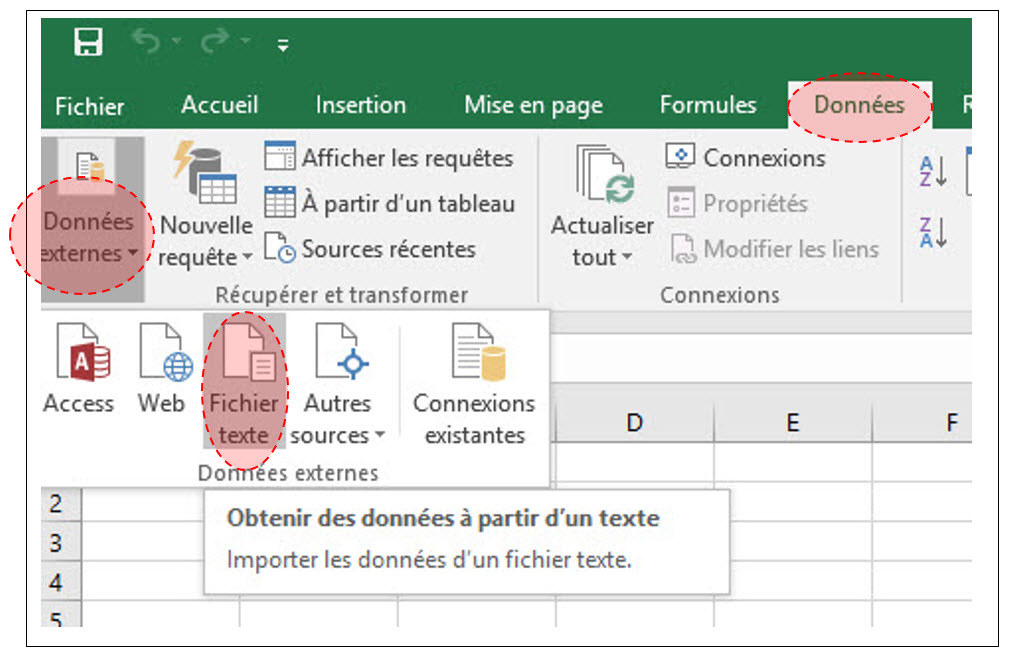 - Ouvrir le logiciel Excel puis importer les données depuis votre fichier texte enregistré précédemment :