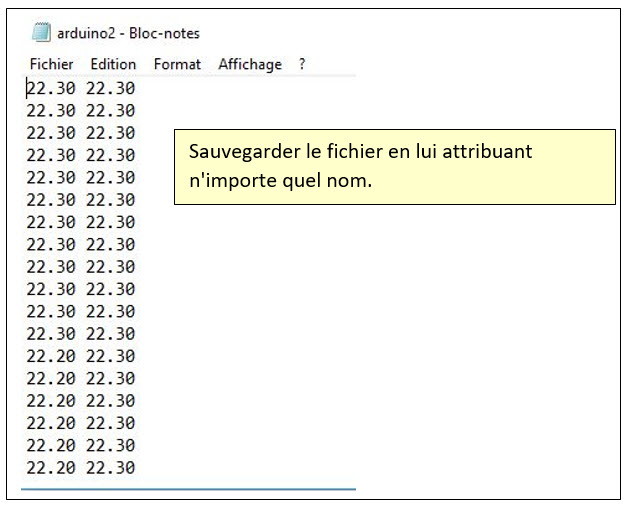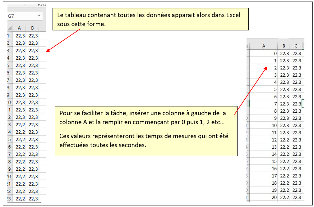 Les mesures se font automatiquement toutes les secondes. Au bout d'une 15aine de minutes, on peut récupérer les mesures en les sélectionnant pour les copier avant de les traiter. Le passage depuis Arduino vers Excel ne peut se faire directement et nécessite de passer par le bloc note Windows.