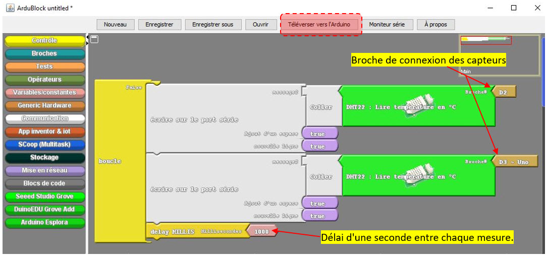 2) Réaliser le programme en bloc de la façon suivante puis cliquer sur "Téléverser vers l'Arduino" :