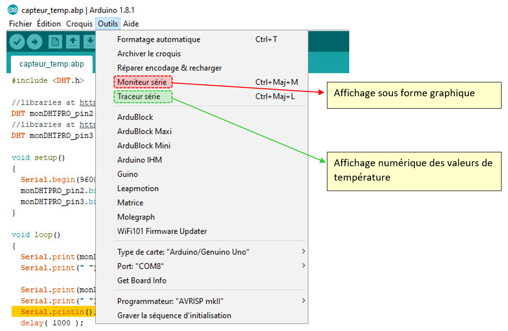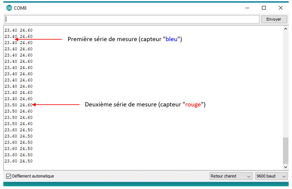 1) Le mode moniteur semble à priori confortable puisqu'il permet de voir en simultané les courbes de température des deux capteurs. En revanche, il est compliqué de capturer le graphique et celui-ci affiche en abscisse des valeurs dont l'unité est le baud. Il est impossible dans ce mode de "jouer" sur les échelles pour mieux faire apparaitre les variations de température.
