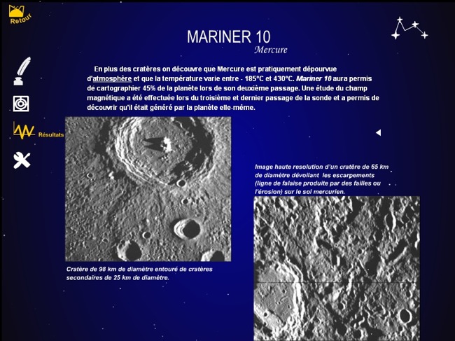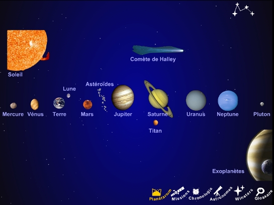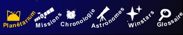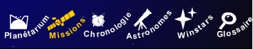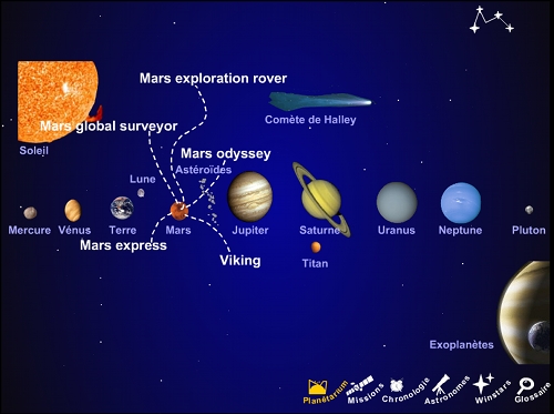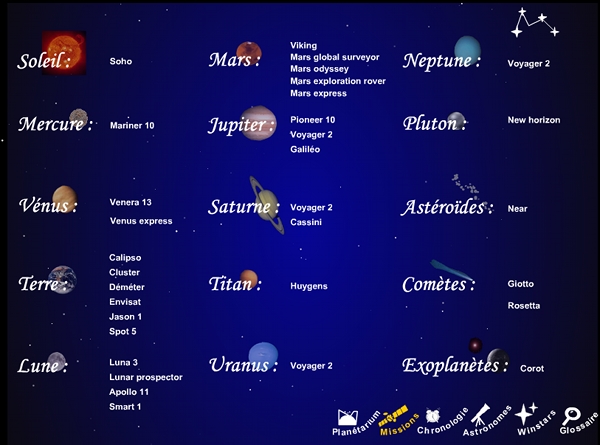 Menu planétarium : il présente les différents objets du système solaire qui ont fait l'objet d'une mission par une des grande agences : NASA, ESA et agence russe.