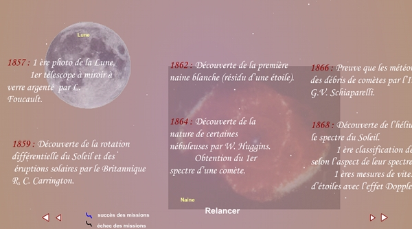 Menu chronologie qui présente sous la forme d'une frise qui défile les grandes dates de l'histoire de l'astronomie.