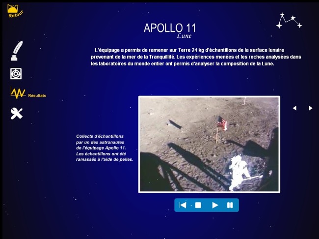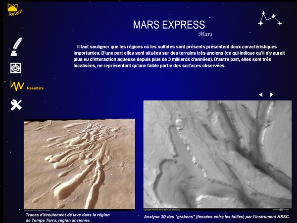Menu Exploration : disponible directement dans le bas de la page. Il affiche toutes les missions présentées dans le cdrom, ces missions sont associées à l'objet de leur étude. En cliquant sur une de ces missions on se retrouve sur les mêmes pages de résultats que celles présentées ci-dessus.