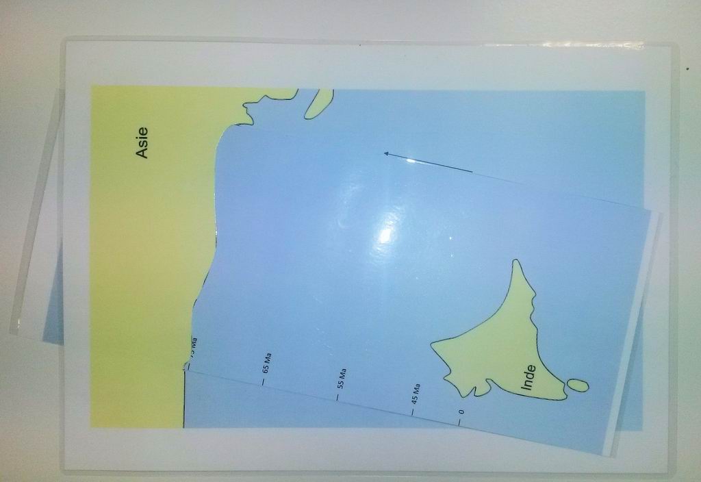 - On tire alors progressivement le second document en suivant l'angle donné par la flèche faisant glisser ainsi l'Inde vers l'Asie jusqu'à la collision vers -45 Ma. Un léger "bourrelet" de sucre doit se former.
