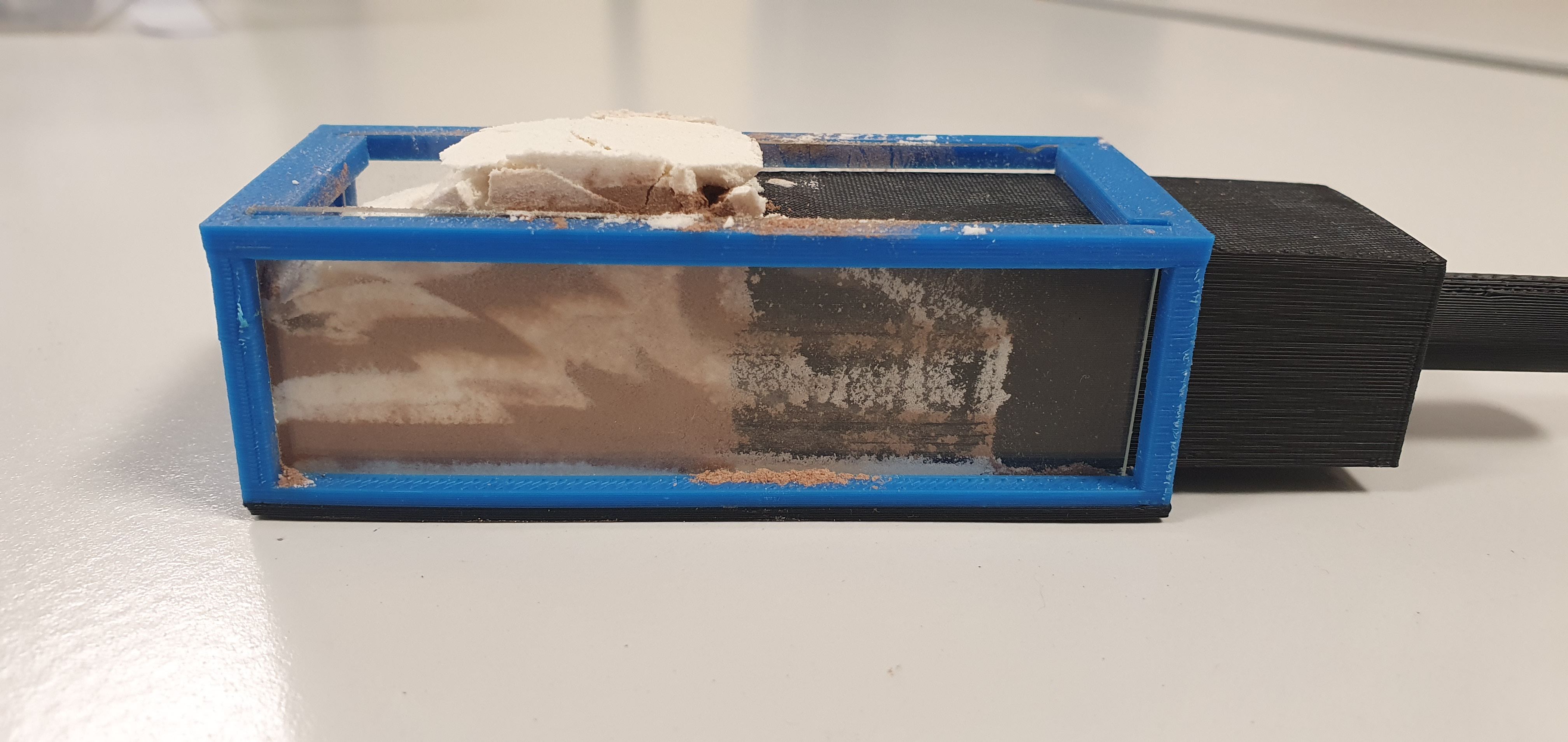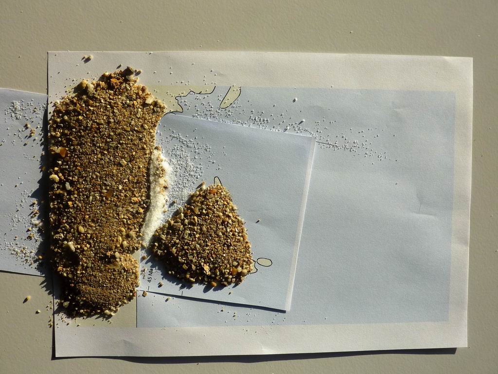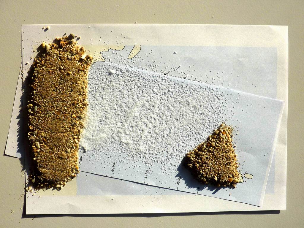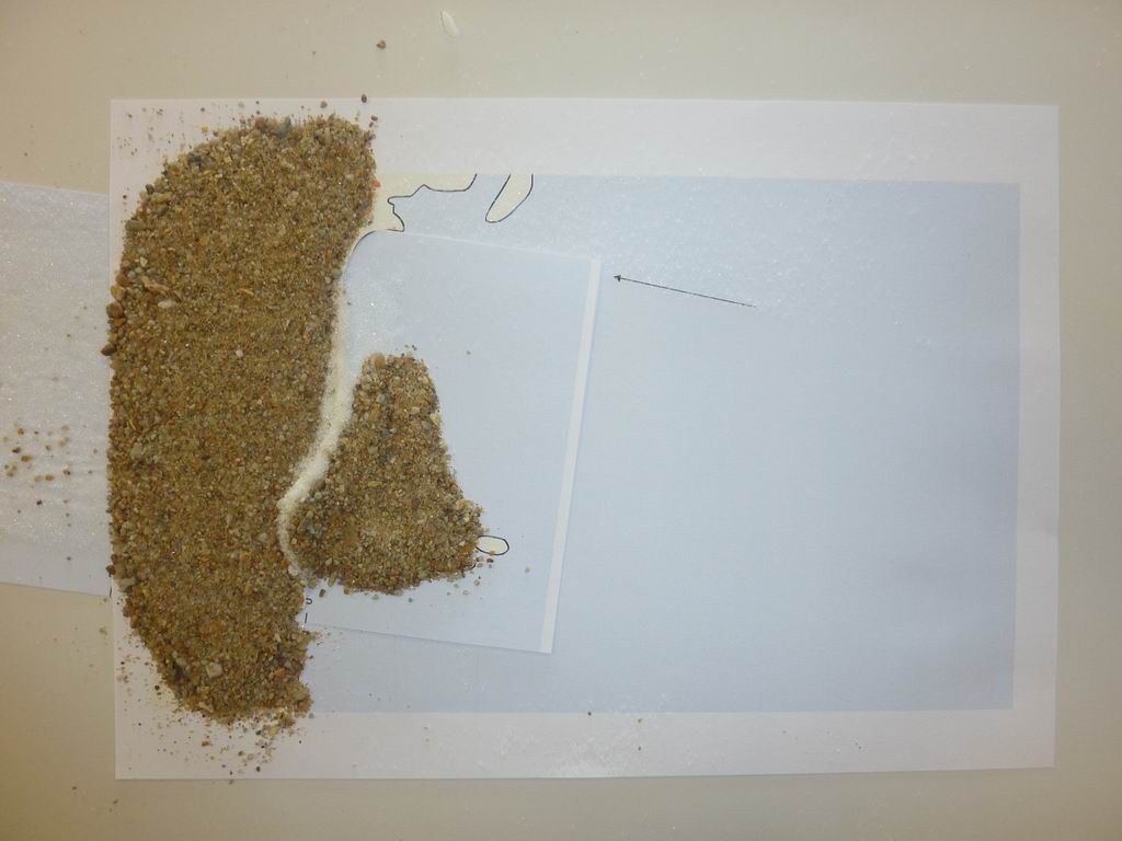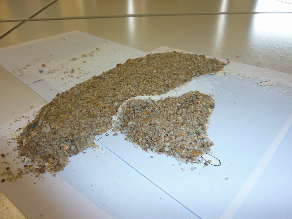 - Les élèves déposent alors du sable type arène granitique ou autre sur le continent asiatique et sur l'Inde. Le sable est légèrement tassé avec le fond d'une boite de pétri par exemple.