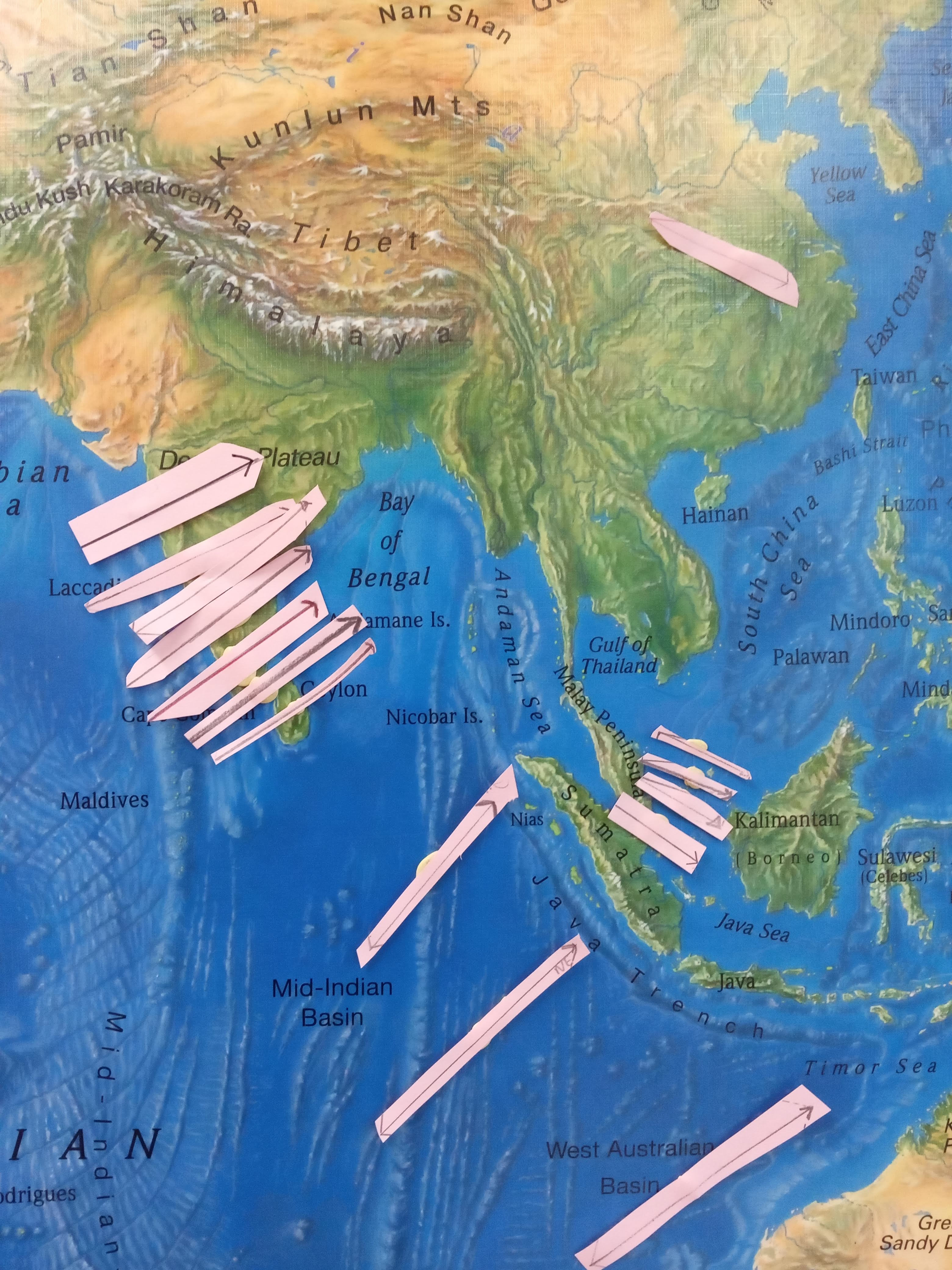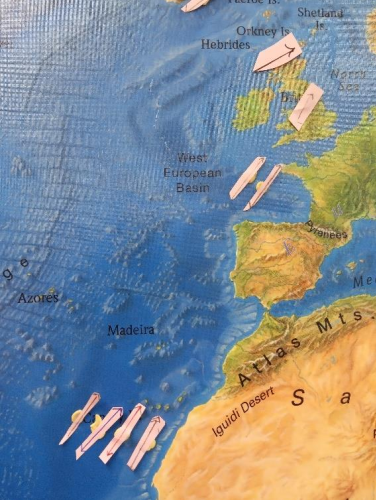 Si vous ne pouvez pas projeter de carte au tableau sur laquelle les élèves peuvent écrire, il y a la possibilité d'utiliser un fond de carte sur lequel les élèves collent avec du mastic adhésif leur flèche découpée.