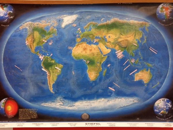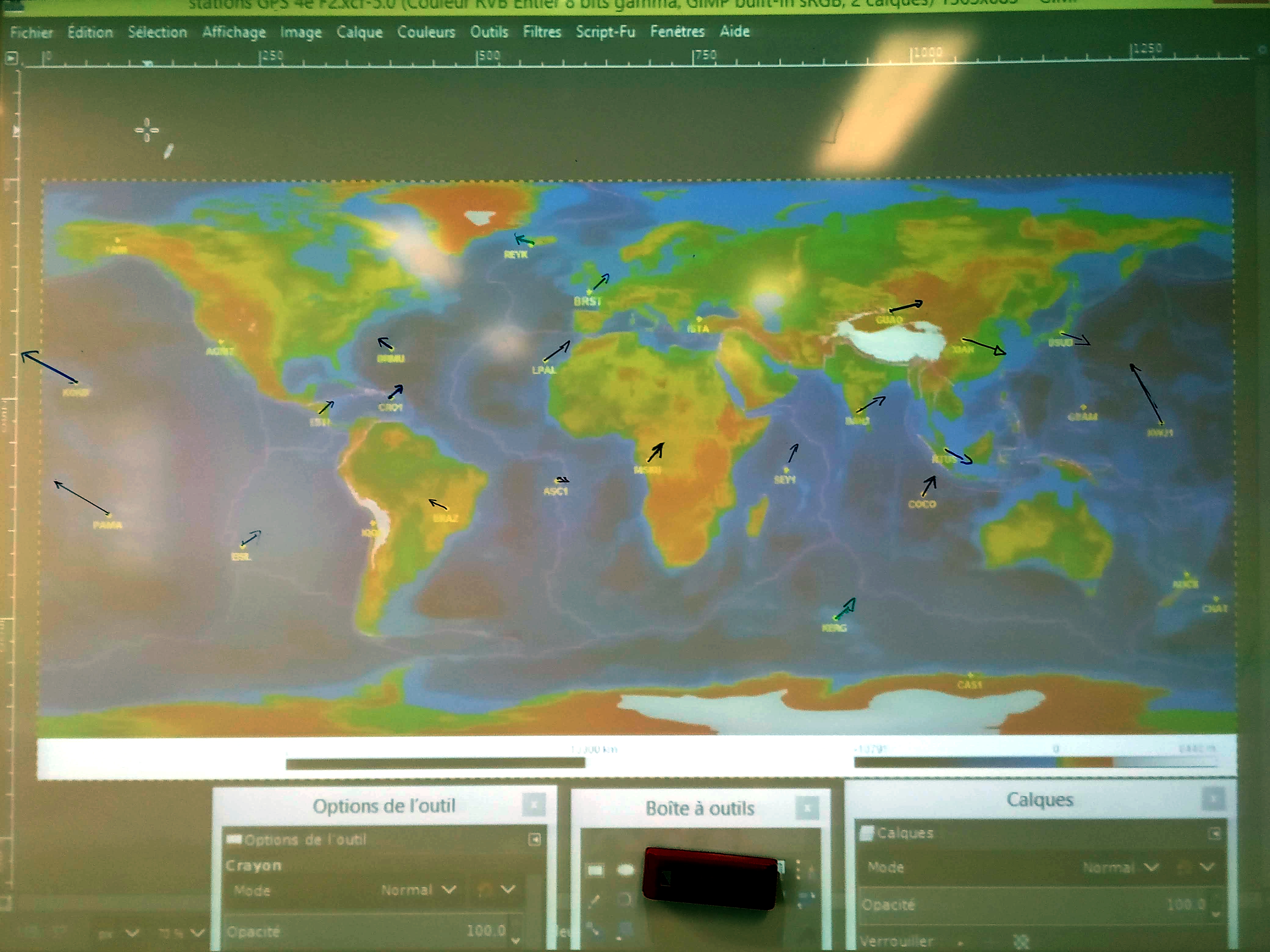 Une carte du monde où figurent des stations GPS est projetée au tableau, chaque station est codée.