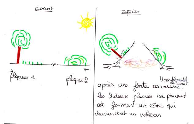 Pour d'autres élèves, l'édifice volcanique résulte de la collision entre deux plaques, ou de la lave sort du volcan, mais le lien entre formation de l' édifice volcanique et émission de matériaux par le volcan n'est pas établi.