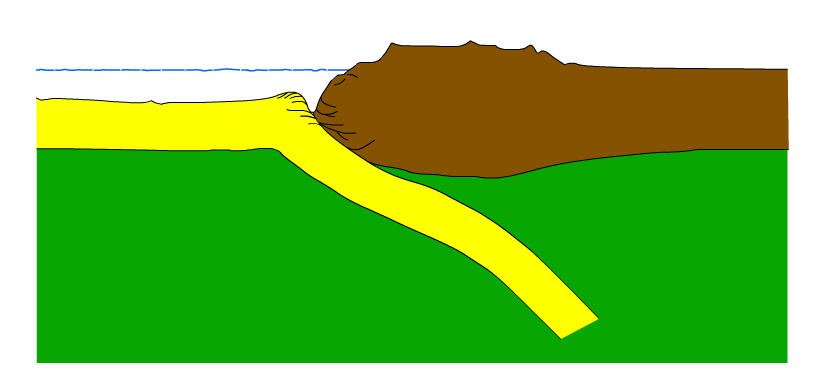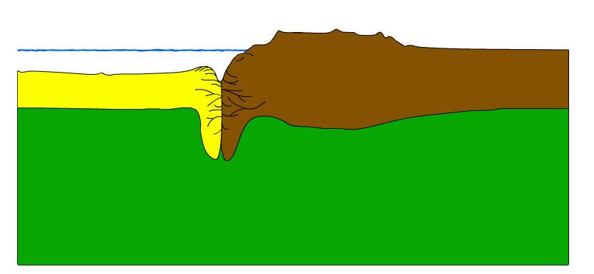4 - Constater alors l'affrontement des deux plaques au niveau de la fosse et représenter leur rapprochement par des flèches bleues.