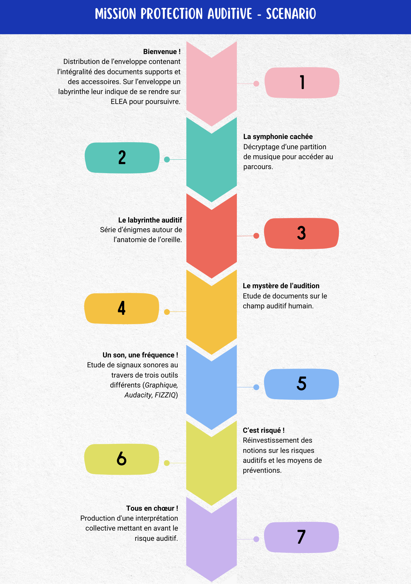 Dans le cadre d'un projet pédagogique commun centré sur les risques auditifs, nous avons souhaité proposer aux élèves une séance de co-animation visant à recontextualiser toutes les notions abordées dans les différentes disciplines. Le déploiement imminent d’ELEA au sein de l’académie et la récente formation sur son utilisation dans notre établissement nous ont naturellement conduits à envisager un parcours gamifié pour cette séance finale.