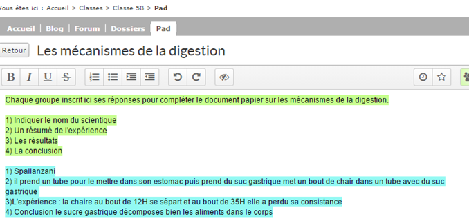 - Chaque groupe réalise ses réponses au brouillon puis ce connecte à e-lyco et va inscrire ses réponses dans le "PAD" qui aura été préparé en amont de la séance.