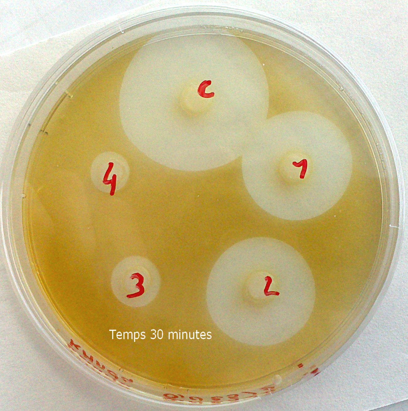 -"bactérie" : permanganate de potassium (0,0125 mol/L) -"antibiotiques" : sels de Mohr en concentration décroissante au 1/2 à chaque fois, la plus concentrée (pastille 0) étant à 0.5 mol/L | ![]() |