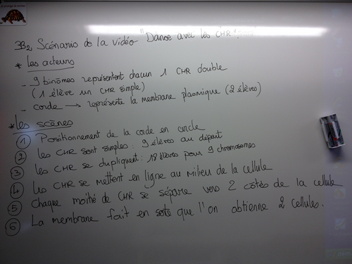 Les élèves après avoir visionné l'ensembles des vidéos se sont concertés. Un élève est venu rédiger le scénario au tableau. Un ou deux élèves responsables de la membrane plasmique, mise en place des binômes, un élèves pour dire les différentes étapes du scénario lors de la prise de vue pour que tout le monde soit en phase.