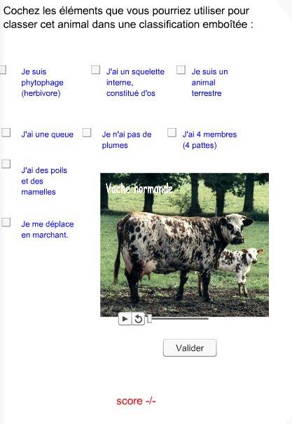 En listant toutes les représentations initiales des élèves sur les critères de classification et en les associant à un animal étudié au cours de l'année (par exemple, la vache laitière, étudiée dans la partie « Des pratiques au service de l'alimentation humaine »), l'élève doit sélectionner les caractères de l'animal pouvant être utilisés pour réaliser une classification emboîtée.