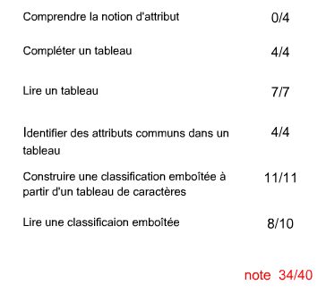 Dans ce cas, on s'aperçoit que l'élève n'a pas compris la notion d'attribut, mais qu'il sait compléter une classification emboîtée, lire et compléter un tableau. Il sera utile de lui proposer des exercices de remédiation sur la notion d'attribut.