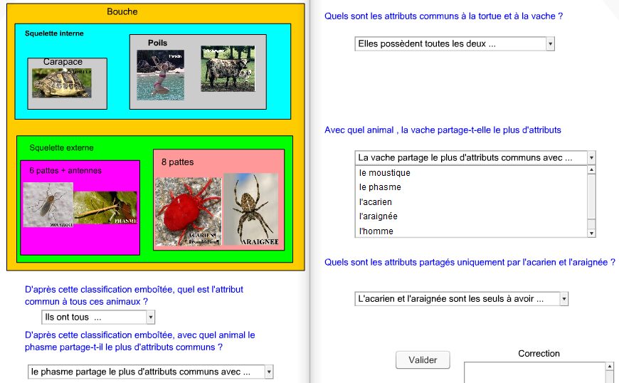 Des questions portant sur le tableau, qui est présenté corrigé, permettent de savoir si l'élève, à défaut de savoir construire la classification emboîtée, sait la lire ; en effet, certains élèves de sixième ont bien du mal à construire la classification elle-même, car elle nécessite de faire une synthèse des informations du tableau de caractères, mais il est essentiel qu'ils aient compris le principe de lecture d'une telle classification, ceci afin d'aborder plus aisément la notion d'évolution, en troisième.