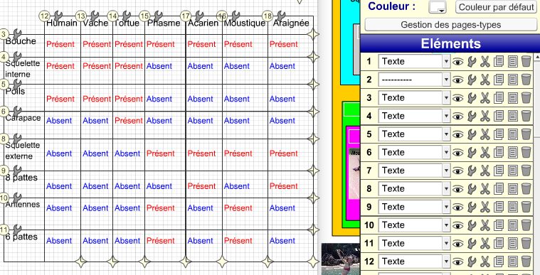 - La construction d'un tableau peut être réalisée directement avec Didapage, en réalisant plusieurs zones texte successives et en les alignant les unes par rapports aux autres. Il suffit alors de sélectionner la couleur du bord pour afficher les traits.