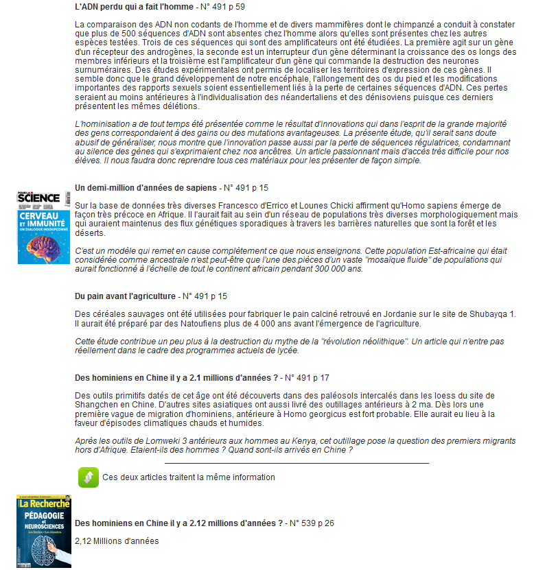 Un document très utile pour notre formation personnelle mais sans doute un peu trop complexe pour nos élèves. On regrettera peut-être que deux faits sujets à controverse soient présentés sans nuances. Il s'agit essentiellement du rattachement de l'homme de Flores aux Homo erectus et de la position systématique d'Homo naledi.