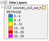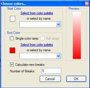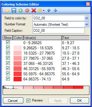 La gradation de teinte s'affiche avec les bornes de classes choisies de façon automatique. Ces bornes peuvent être changées numériquement en les remplaçant par d'autres valeurs dans "Values". Elles peuvent aussi être changées graphiquement dans la barre horizontale au bas de l'écran en faisant glisser les limites. Pour que l'affichage de légende soit correct, il convient de modifier les valeurs "Text" en conséquence.