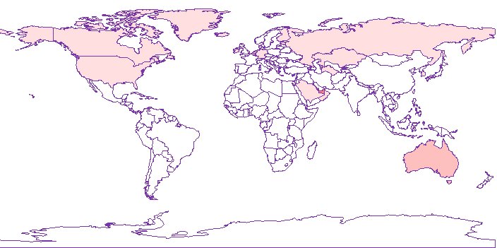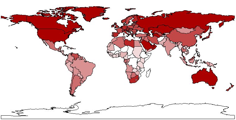 Voici par exemple la carte obtenue en discrétisant les données PETRO08. Les unités sont des tonnes de CO2 issues de la consommation du pétrole par habitant et par an.