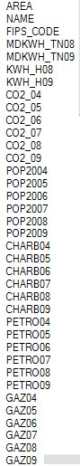 AREA représente la surface en km², NAME est le nom du pays, FIPS_CODE est le code international du pays, MDKWH_TN08 et 09 sont les quantités totales d'énergie électrique produite par pays en Milliards de KWH en 2008 et 2009, KWH_H08 et 09 sont les nombres de kWh produit par an et par habitant en 2008 et 2009 CO2_04 à CO2_09 sont les quantités totales de CO2 produites par habitant et par an en tonnes entre 2004 et 2009, POP2004 à POP2009 sont les populations entre 2004 et 2009, CHARB04 à CHARB09 sont les quantités de CO2 produites à partir de l'utilisation du charbon par habitant et par an en tonnes entre 2004 et 2009, PETRO04 à PETRO09 sont les quantités de CO2 produites à partir de l'utilisation du pétrole par habitant et par an en tonnes entre 2004 et 2009, GAZ04 à GAZ09 sont les quantités de CO2 produites à partir de l'utilisation du gaz par habitant et par an en tonnes entre 2004 et 2009