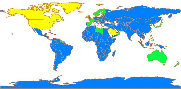 Ce résultat obtenu en quelques minutes lors de la séance de découverte de l'outil montre assez mal les disparités Nord Sud qui ont été au coeur des discussions des sommets de Kyoto et de Copenhague en raison des intervalles égaux. Cela peut être l'occasion de faire comprendre aux élèves que la discrétisation est un élément primordial pour qu'une carte soit lisible.
