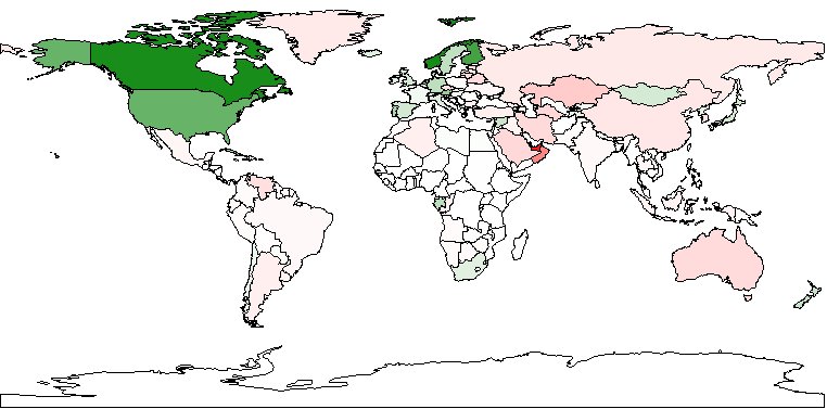 La question des évolutions des émissions peut être traitée en discrétisant la différence entre les émissions de 2008 et celles de 2004. Cette carte fabriquée avec fGIS (voir le tutoriel dans cette rubrique) permet de voir que les évolutions sont aussi à l'image de l'état de développement. Presque tous les pays du nord connaissant une évolution faiblement négative alors les états dotés de réserves de combustibles fossiles montrent des augmentations pouvant dépasser 10 tonnes de CO2 par habitant sur cinq ans (Quatar, Brunei).