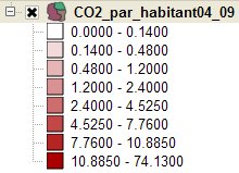 Avec la discrétisation par quantiles (équipopulation) disponible avec le logiciel gratuit QGIS, les choses sont plus lisibles. Les pays du sud et les pays émergeants produisent peu de CO2 par habitant alors que les pays développés en produisent beaucoup avec une mention spéciale pour les pays où les énergies fossiles sont bon marché. Ceux de la péninsule arabique et l'Australie.