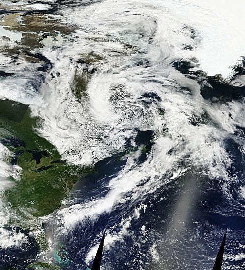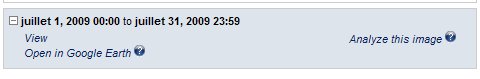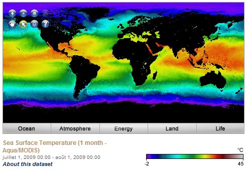 Les images captées par le satellite MODIS sont disponibles dans "True colors" de l'onglet "Atmosphere". Il existe une image par jour depuis 2006. Il s'agit ici d'un montage d'images du 14 juillet 2009.