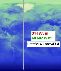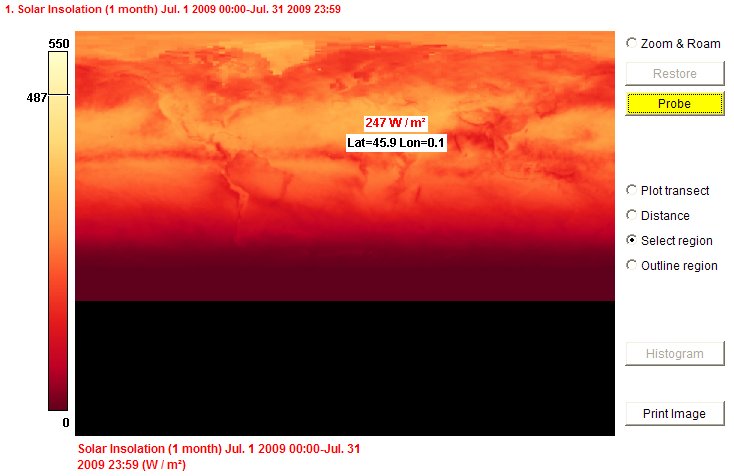 Après un délai d'affichage qui peut être assez long en fonction de la connexion, l'image est chargée et l'outil "Probe" permet d'accéder à la valeur de l'insolation en n'importe quel point du globe durant le mois étudié.