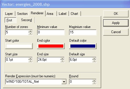 En modifiant les propriétés du thème, il est possible de programmer la discrétisation ("Use renderer" dans l'onglet "Area" puis paramétrage dans l'onglet "Renderer") avec la fonction qui donne le pourcentage d'énergie hydroélectrique par rapport au total de l'énergie électrique produite.