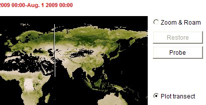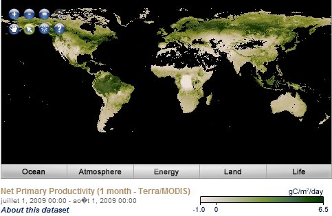 Le choix d'une de ces variables affiche la couche d'information correspondante. Des outils sont disponibles sur l'image pour effectuer quelques manipulations. Il s'agit ici de la productivité primaire nette pour le mois de juillet 2009.