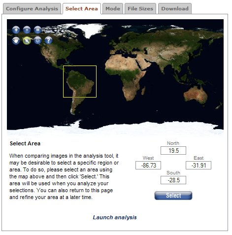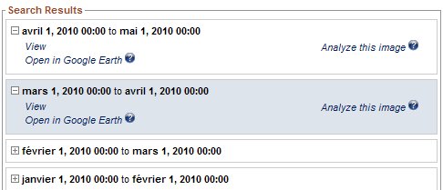 Une liste de choix donne accès aux archives et permet ainsi de sélectionner la période de mesure. Généralement les mesures sont filtrées et moyennées sur un mois, ce qui permet la plupart du temps de s'affranchir des masquages opérés par les nuages.