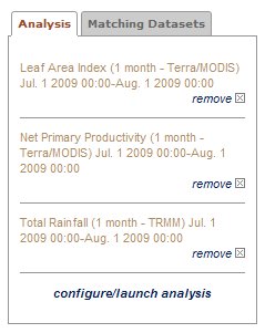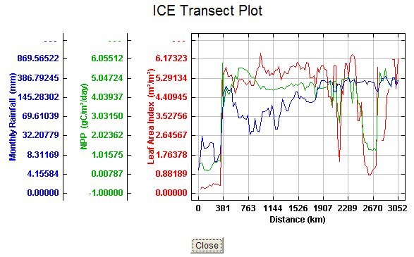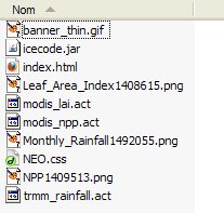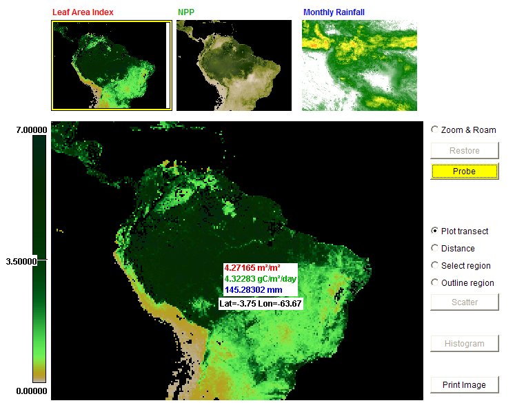 Ici, il s'agit de l'index foliaire, de la productivité primaire nette et des précipitations (Total rainfall, trouvé dans le menu "Atmosphère") pour le mois de juillet 2009.