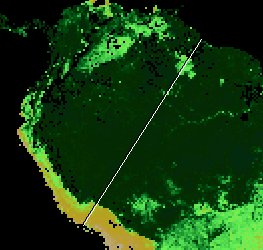 La côte ouest de l'Amérique du Sud montre à la fois de faibles précipitations, un faible indice foliaire et surtout une faible productivité primaire.