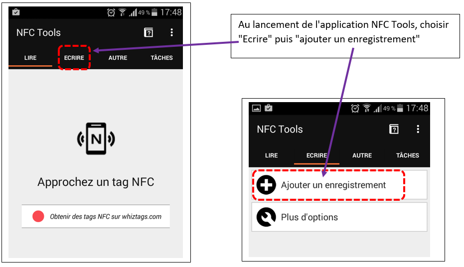 En revanche, celui qui programme l'écriture dans le Tag NFC aura besoin d'une application pour programmer le Tag NFC. Il existe de nombreuses applications gratuites sur le Playstore Google. Nous utiliserons dans ce tutoriel l'application NFC tools.