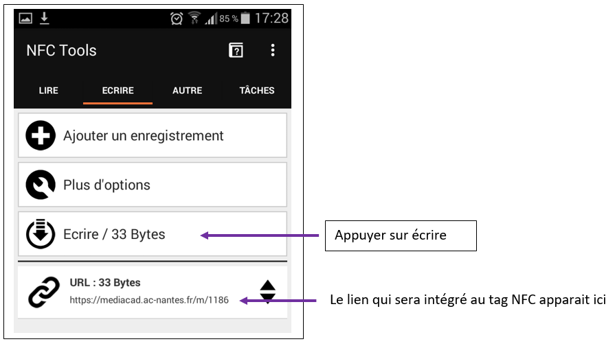 L'écriture du Tag NFC est terminée. Tout appareil posé sur ce Tag NFC réagira en exécutant l'instruction, à savoir ici lancer le navigateur internet et se diriger sur médiacad pour lire la vidéo déposée.