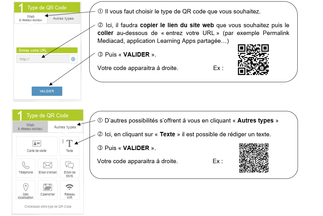 Les QR codes sont de simples symboles imprimés qui permettent, lorsqu’ils sont lus par la caméra d’un smartphone ou d'une tablette équipés d’une application de lecture appropriée, de se connecter directement à une page internet déterminée. Ils permettent alors d'enrichir le support papier de l'élève en données numériques, qui peuvent être stockées sur Médiacad (Médiathèque académique) une application web qui permet l'envoi, l'encodage, le stockage, le partage et la diffusion (streaming, affichage et téléchargement) de médias (vidéos, sons, images et livres numériques).