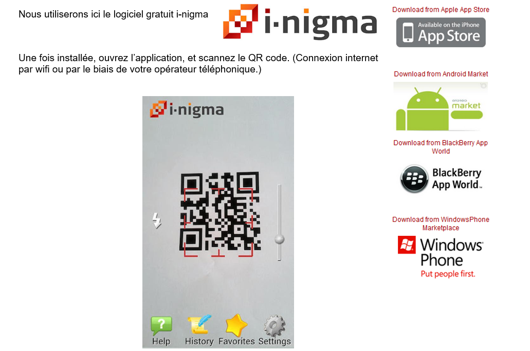 Remarque: l'application "appareil photo" de l'iphone peut faire office de lecteur de QR Code.